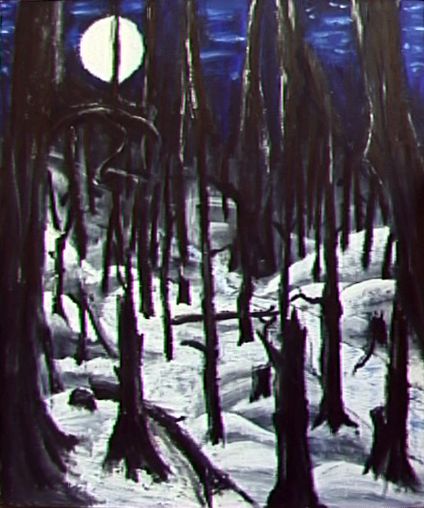 A moonlit snowy forest.